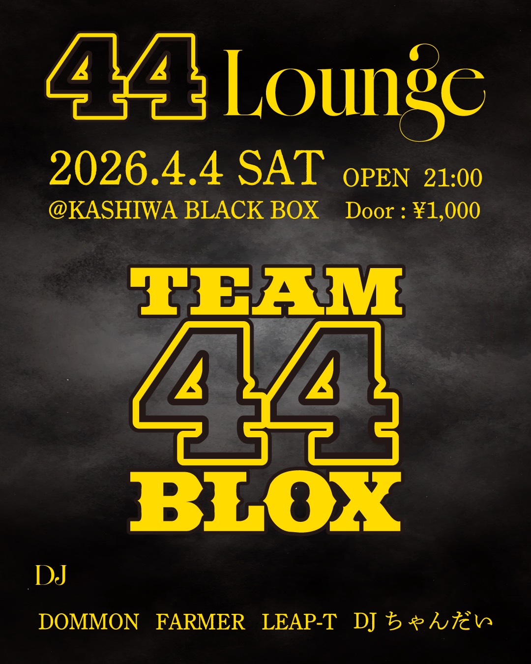 4 / 4 44 Lounge44 Lounge2026.4.4 SATOPEN 21:00@KASHIWA BLACK BOXDoor : ¥1,000DJDOMMONFARMERLEAP-TDJ ちゃんだい